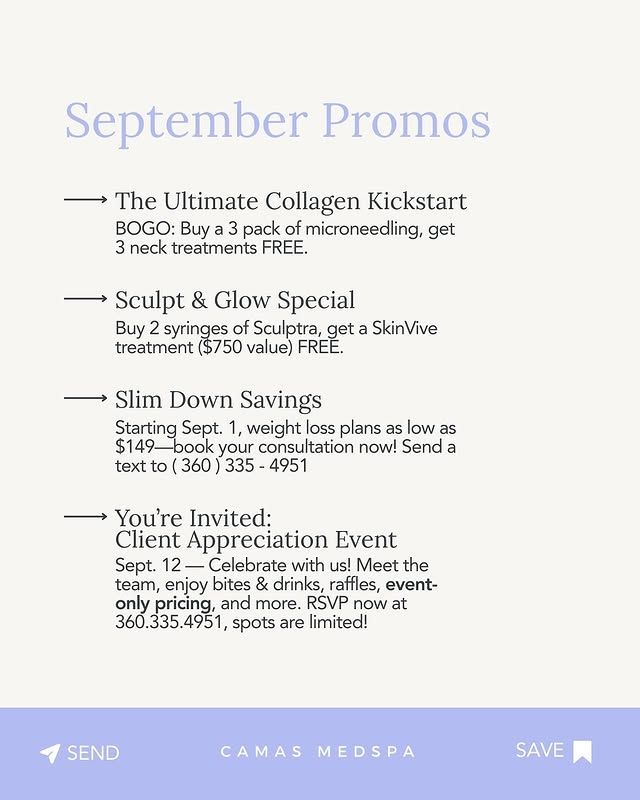 ✨ SEPTEMBER SPECIALS ARE HERE! ✨ Ready to glow, sculpt, and slim down this fall? Check out our limited time promos only at Camas MedSpa 💜 💉 BOGO Microneedling – Buy a 3 pack, get 3 neck treatments FREE 💫 Sculpt & Glow – Buy 2 Sculptra syringes, get a $750 SkinVive treatment FREE ⚖️ Weight Loss Plans starting at just $149 – book your consult today! 🎉 Client Appreciation Event on Sept. 12 – bites, drinks, raffles, and exclusive pricing! 📲 Text or call 360.335.4951 to book or RSVP now — spots are limited! #CamasMedSpa #SeptemberPromos #Microneedling #Sculptra #SkinVive #WeightLossJourney #clientappreciationButton