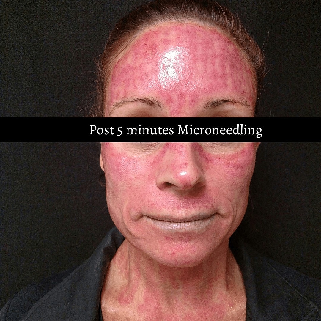 This client received a Microneedling because she wanted smoother tone and texture to her skin and to build collagen. This redness will be gone within a day or two, and we provide take-home products specifically designed for this treatment including a sunscreen with primer to use a cover up for the first 4 days.